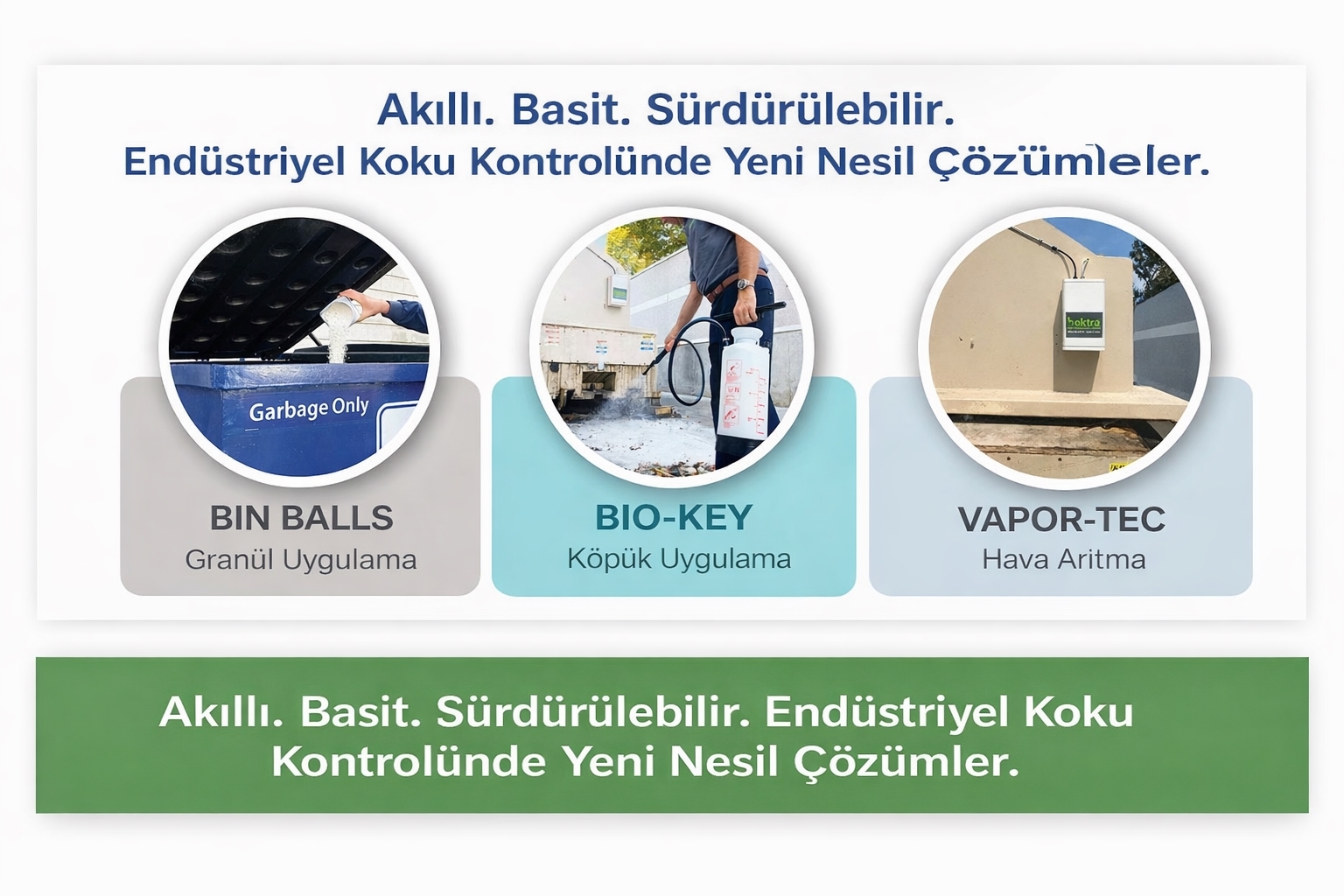 Yenilikçi koku yönetimi teknolojileri ile geliştirilen çözümler, endüstriyel alanlarda hava kalitesinin iyileştirilmesine yardımcı olur. Bin Balls, Odor-Key VP, Odor-Key, BIO-KEY, Vapor Tec ve Fog and Vapor Cannons ürünleri ile farklı koku problemlerine etkili çözümler sunulur. Bu ürünler, koku kontrolü sağlarken çevresel gerekliliklere uyumu destekler. Türkiye distribütörlüğünü yürüttüğümüz Bektra ürünleri; hava arıtma, sisleme, buhar ve yüzey uygulamaları için özel olarak geliştirilmiş koku nötralizasyon teknolojileri sunar.